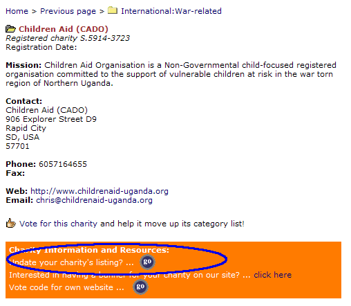 Please use the update button on your listing panel (screenshot below). You will need to enter your authorisation code in order to reach the update screen. If you do not yet have your authorisation code you can request it be emailed to your charity. In that case the code is sent to the email address that we have on file for your charity.